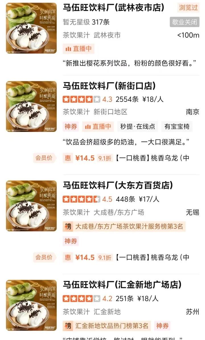 记者实地探访发现,马伍旺饮料厂的嘉里中心和in77门店早已关闭,而其在杭州的最后一家门店——武林夜市店,如今也已“查无此店”,原商铺位置已换成一家售卖果茶的门店。