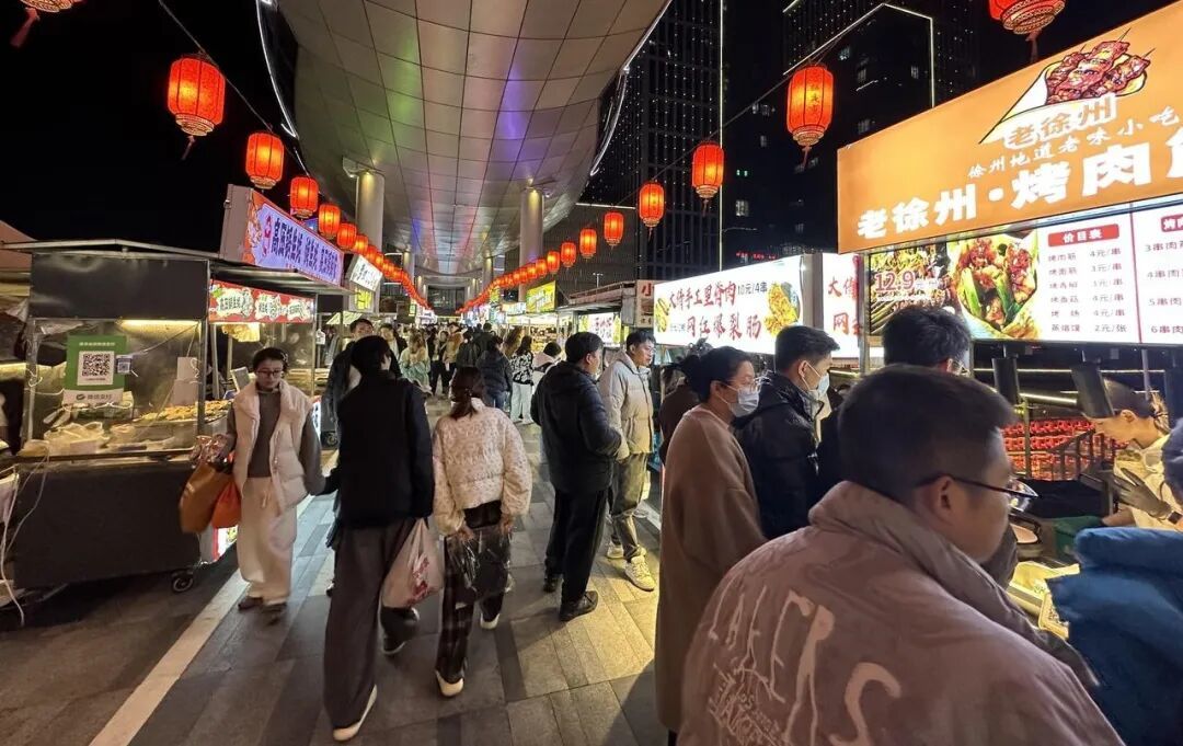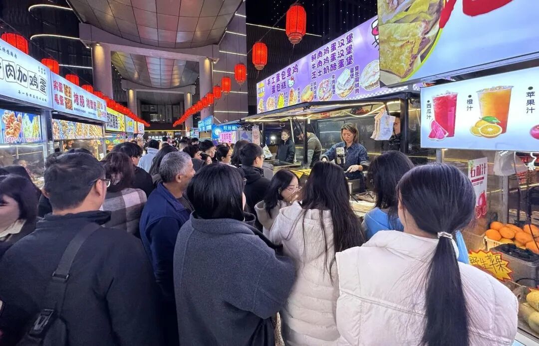 焦香的窑炉披萨、分量十足的葱饼、暖胃的糖水,150多个特色摊位集聚在了万联城室外廊桥和广场上。彩色的灯带点亮冬夜,映着夜市上摩肩接踵的人群,人气与烟火味十足。