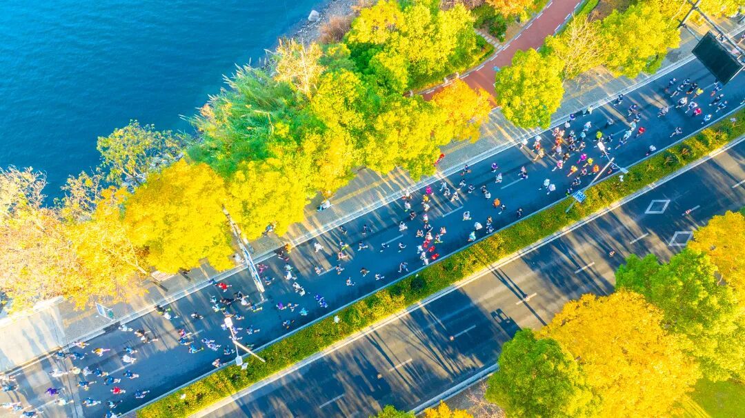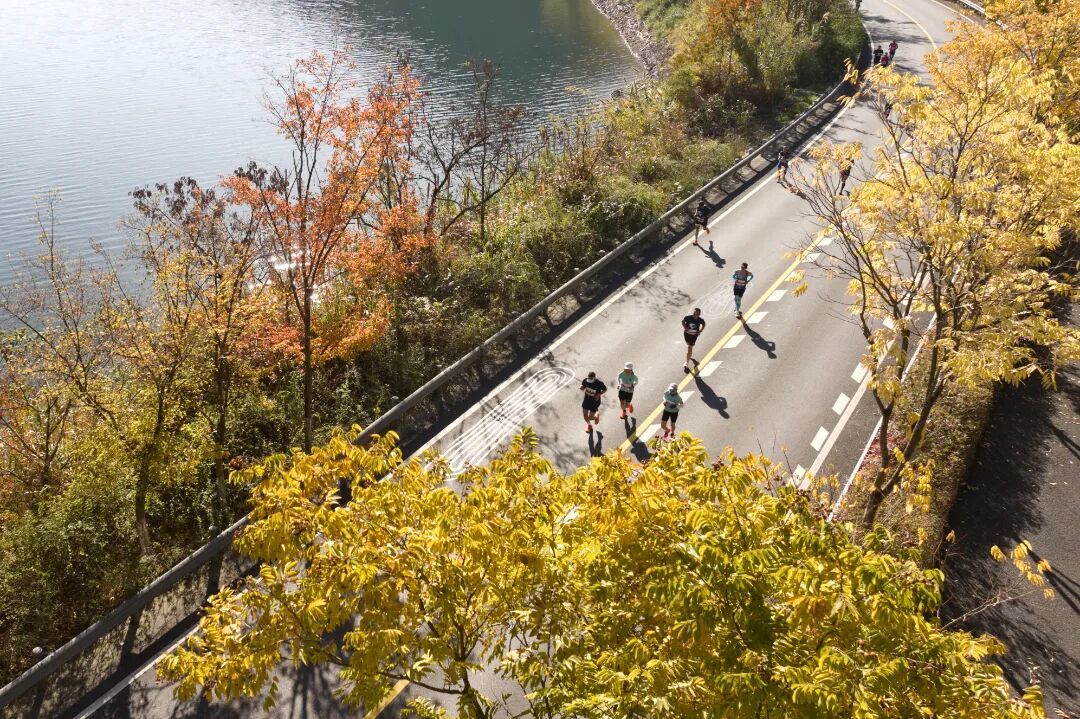 跑友们沿全国十大最美农村路之一的淳杨线奔跑,红枫、黄叶、绿松与碧水交织,千岛湖仿佛一个被打翻了的调色盘,每一帧都是壁纸级风景。