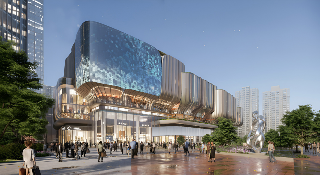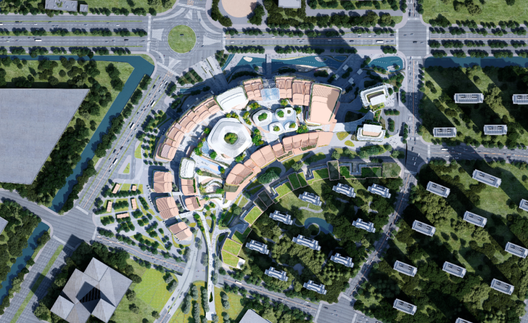 项目整体设计由国际顶尖的设计团队操刀,设计理念新颖潮流,以“诗意江南,山水画扇”为灵感,融合商业、办公与自然生态等多种功能。