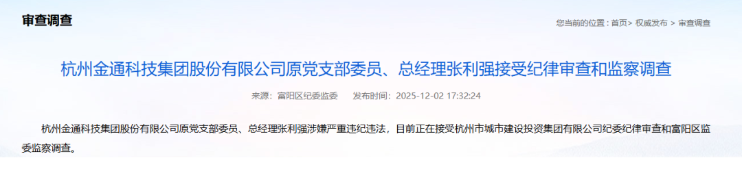 杭州金通科技集团股份有限公司原党支部委员、总经理张利强涉嫌严重违纪违法,目前正在接受杭州市城市建设投资集团有限公司纪委纪律审查和富阳区监委监察调查。