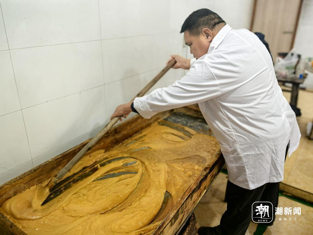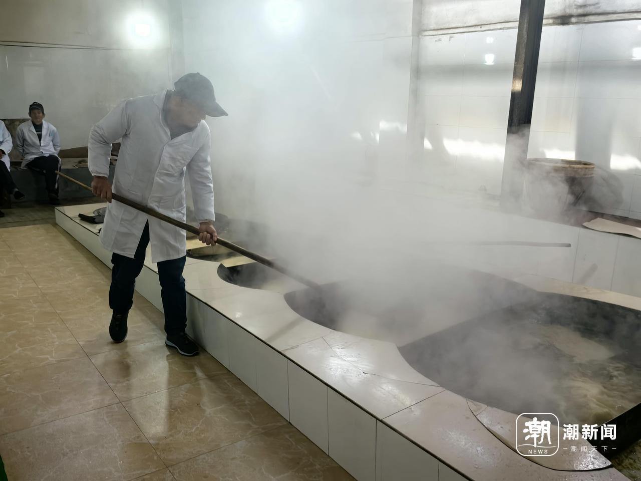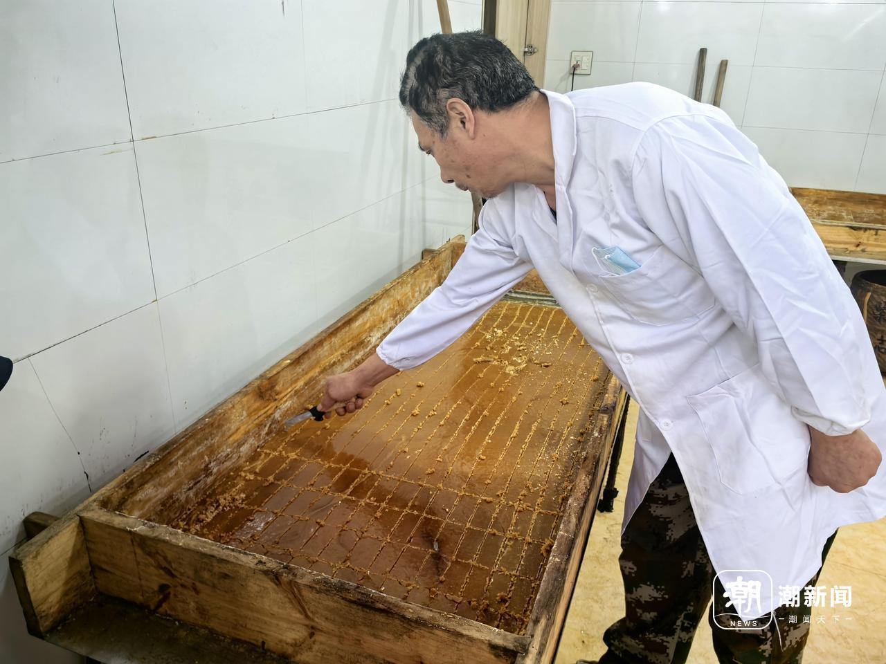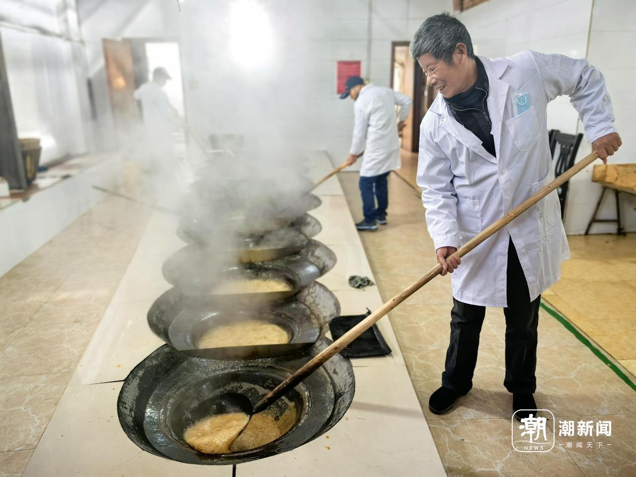 “熬糖考验的是师傅对于糖水浓稠程度的把握,对品质的把控全凭经验和眼力。”75岁的熬糖师傅柳维有近50年的制糖经验。伴随着锅内温度的升高,糖水沸腾,他掐准时间用2米高的长柄铁勺捞出糖沫等杂质,反复撇沫、熬煮,不断搅拌防止糖水黏底。