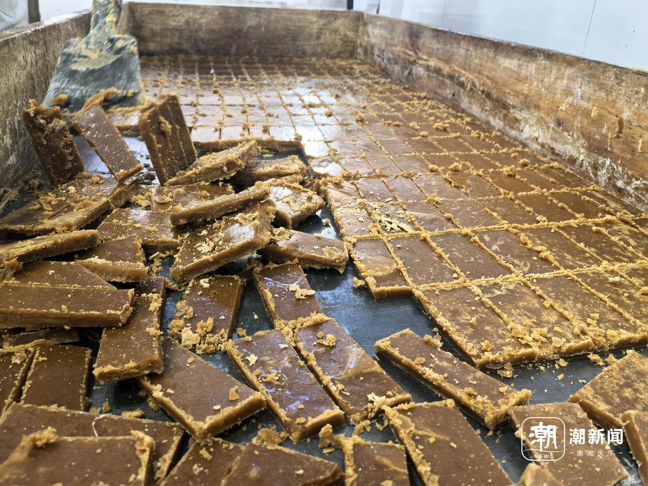 “熬好了!”随着熬糖师傅一声吆喝,滚烫的糖浆被倒入一个长方形的木制槽床上,等待冷却成型,被铲刀分割成块,香味四溢的褐黄色红糖便新鲜出炉。