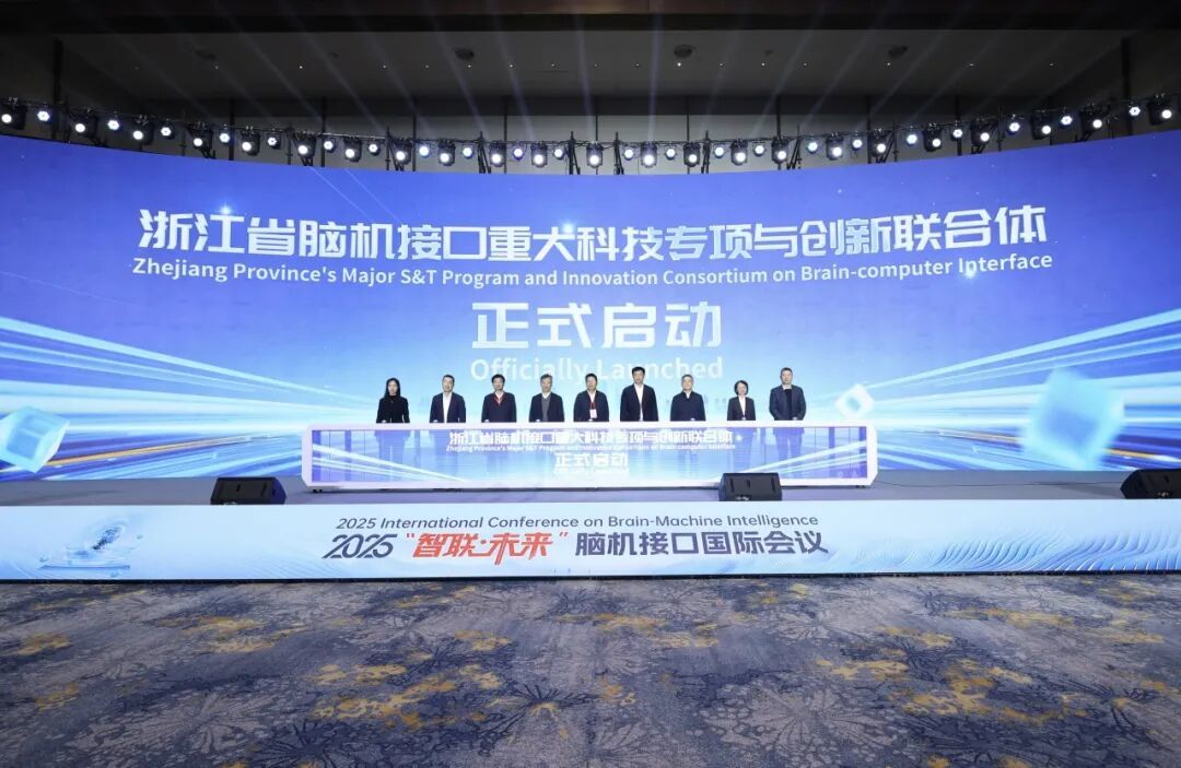 开幕式上,正式启动了《全球脑机智能技术与产业趋势报告》的撰写工作,浙江大学与国际顶尖学术出版机构施普林格·自然集团旗下Nature Research Intelligence合作,通过报告撰写汇聚国内外专家智慧,梳理脑机智能融合发展的前沿与趋势,为全球科研与产业提供权威战略指引;举行了ISO/IEC JTC 1/SC 43脑机接口立项国际标准启动仪式,标志着脑机接口技术全面进入国际标准制定阶段,有助于加快构建全球统一的技术规范与评价体系,推动该领域健康、有序发展;启动了浙江省脑机接口重大科技专项与创新联合体,集聚产学研用多方力量,系统攻关关键核心技术,打造具有国际竞争力的脑机接口产业集群。在主旨报告环节,吴朝晖、冯国平、刘明、骆清铭、时松海聚焦人工智能及脑机接口领域热点议题作主题分享。
