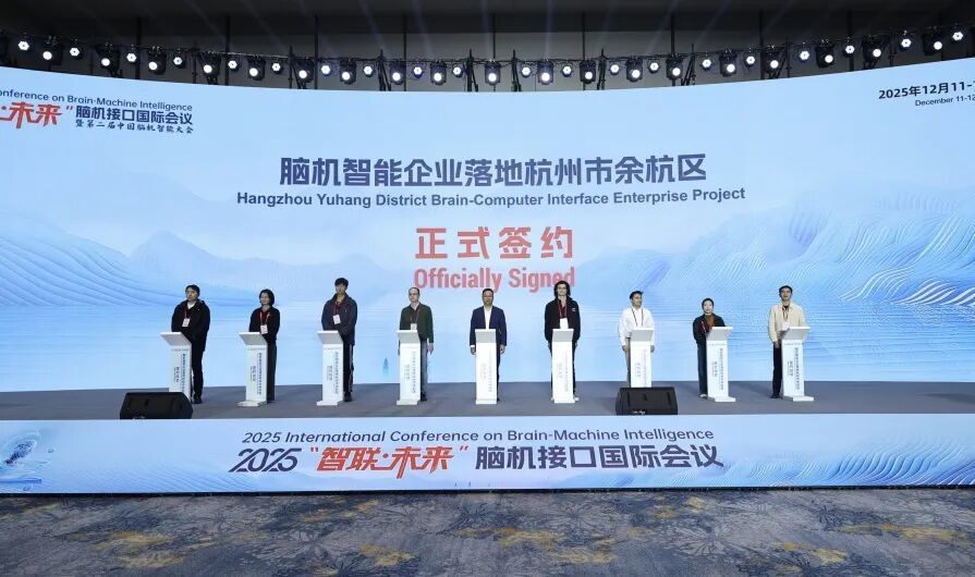 当天还举行了脑机智能企业落地余杭区签约仪式。科无涯生命科技等8家从“创客天下・杭向未来”杭州市海外高层次人才创新创业大赛类脑智能专项赛上脱颖而出的脑机智能企业正式签约落户余杭。