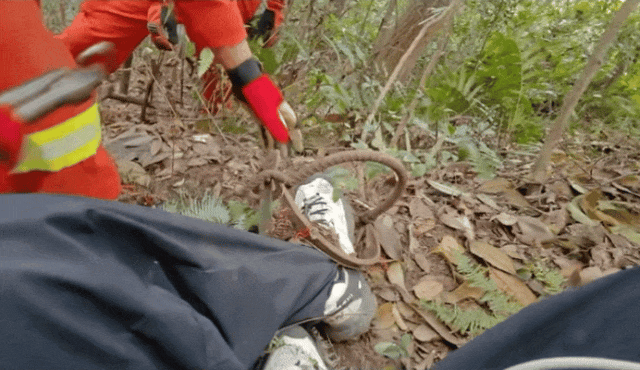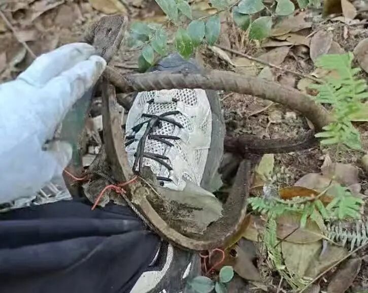 50多岁的冯大伯上山挖野笋,不料右脚误踩野猪夹。他的儿子尝试使用钢锯和撬棍都打不开,只好报警求助。