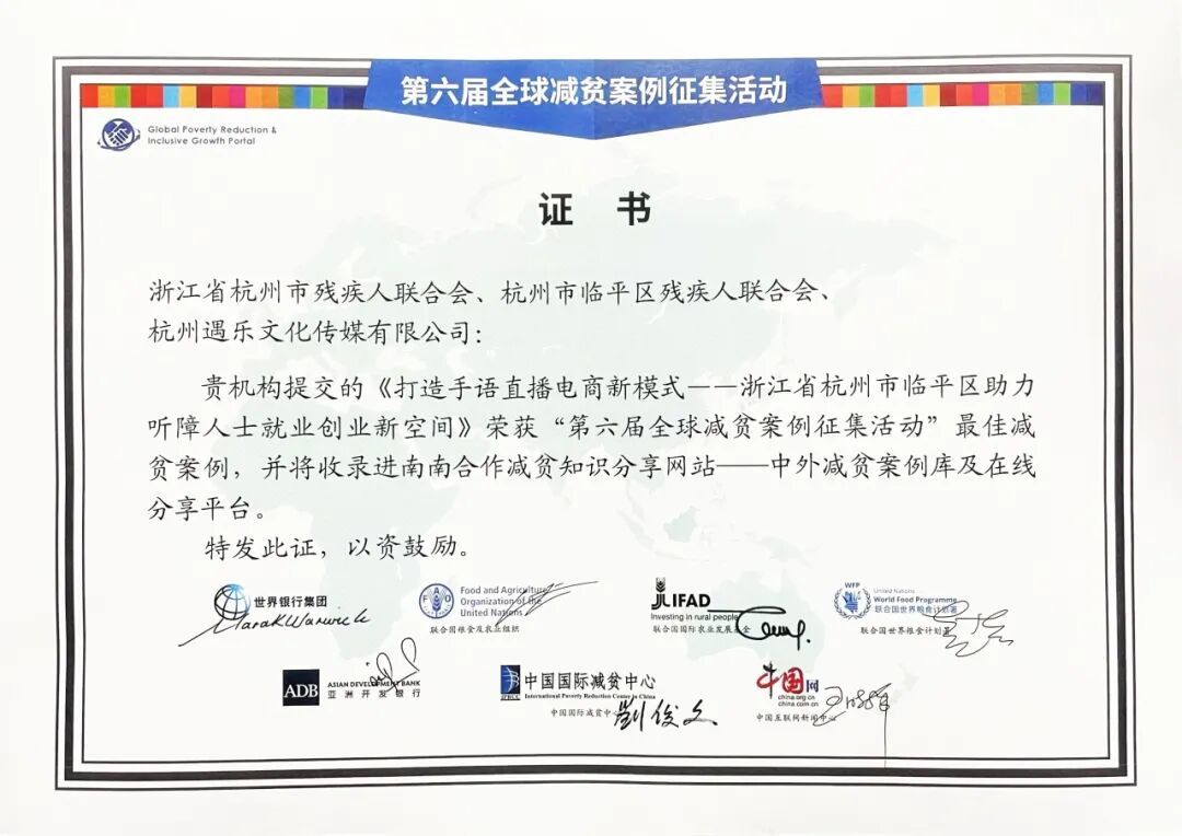12月10日,2025全球减贫伙伴研讨会在北京举行。会上发布了第六届“全球减贫案例征集活动”108个推荐案例名单,由杭州市残疾人联合会、临平区残疾人联合会与杭州遇乐文化传媒有限公司共同报送的《打造手语直播电商新模式——杭州市临平区助力听障人士就业创业新空间》案例成功入选,荣获最佳减贫案例,并将收录进南南合作减贫知识分享网站——中外减贫案例库及在线分享平台。