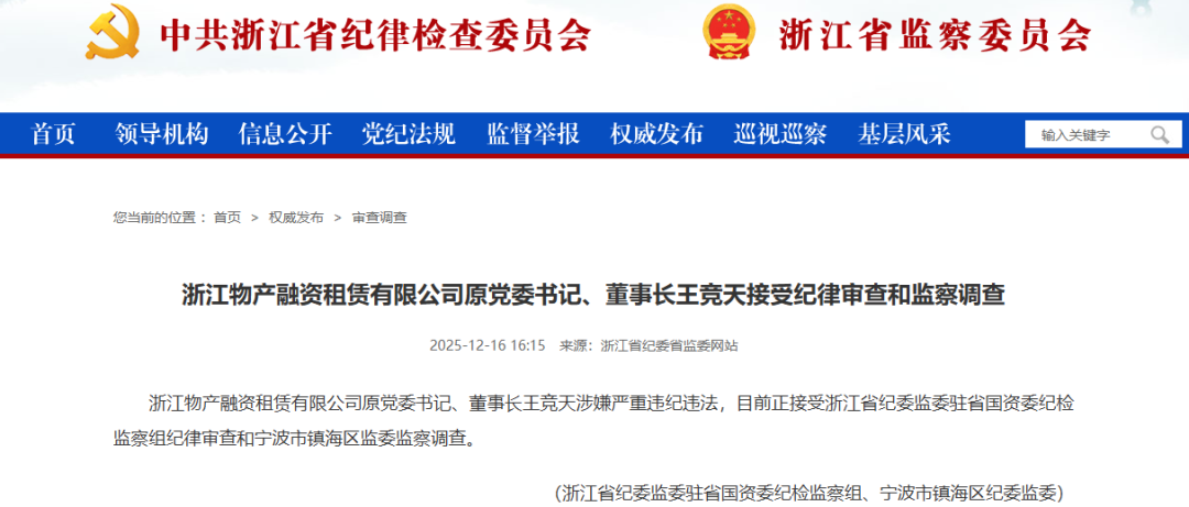 浙江物产融资租赁有限公司原党委书记、董事长王竞天涉嫌严重违纪违法,目前正接受浙江省纪委监委驻省国资委纪检监察组纪律审查和宁波市镇海区监委监察调查。