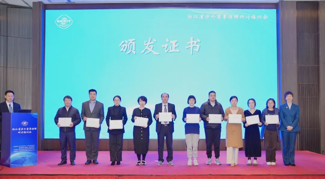 本次研讨培训会内容充实、议程紧凑,既有战略高度的指引,又有实操层面的传授,是浙江加强涉外法治人才队伍建设、完善国际商事纠纷多元化解机制的一次重要行动。会前,陈建忠会长等领导与全体新聘调解员代表合影留念。培训结束,主办方还为各位参训人员颁发了结业证书。
