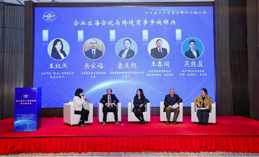 会议特别设置了圆桌交流环节,由北京中伦(杭州)律师事务所王红燕律师主持,邀请马来西亚余家福律师、法国袁展颜律师、招商局集团原总法律顾问王春阁先生、浙江师范大学法学院吴奕盈老师等境内外专家,围绕企业出海面临的合规挑战、争端解决路径选择等议题展开深度对话,为参会者提供了跨法域、多维度的专业视角与实务洞察。
