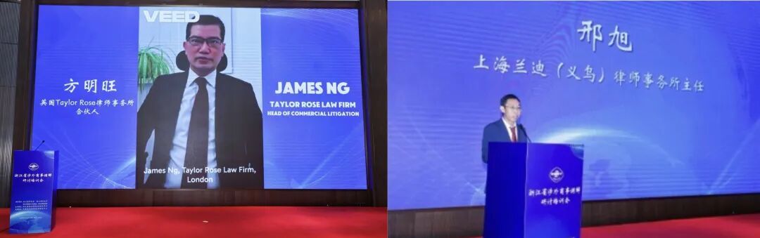 调解员代表英国Taylor Rose律师事务所合伙人James Ng(方明旺)、上海兰迪(义乌)律师事务所主任邢旭分别通过视频和现场发言方式,结合自身专业背景与实践经验,分享了对商事调解的独到见解。