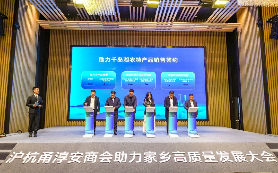 现场还进行了淳商回归项目签约、助力千岛湖农特产品销售签约和委托招商签约。文昌镇与杭州井唐文化传媒有限公司签订渔生记陆基养鱼项目,千岛湖镇与杭州瑞络路寻网络科技有限公司签订AI软件销售总部项目,旅游度假区(杭千飞地)与浙江越迁科技有限公司、杭州方仙翁健康科技有限公司分别签订AI驱动汽车金融科技平台项目、AI智泡茶饮机销售总部项目,总投资约1.5亿元。临岐镇、千发集团、杭州千岛湖众合穗通农业有限公司分别与上海缘源餐饮管理有限公司、宁波金叶堡进出口有限公司、杭州网娘电子商务股份有限公司签订助力千岛湖农特产品销售协议。县投促局与三地商会分别签订委托招商协议,协助淳安引入优质企业和提升知名度。