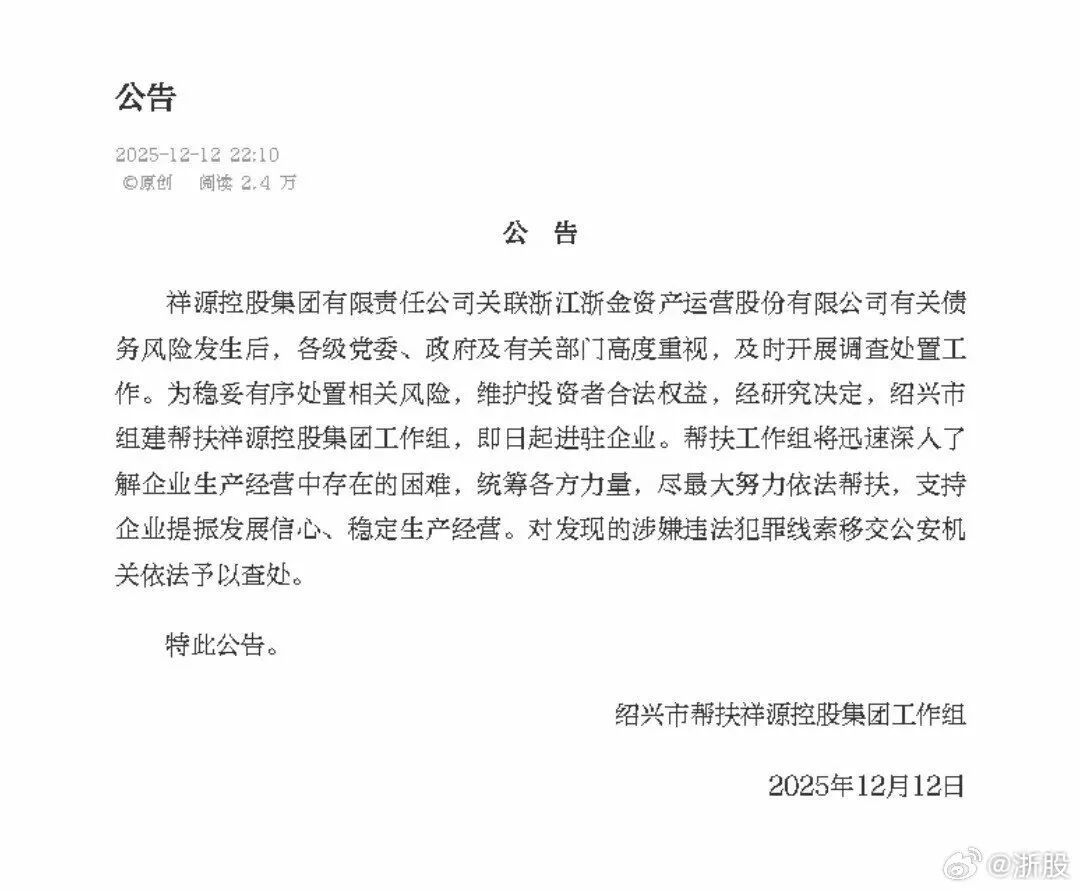 祥源控股集团总部位于绍兴市,其在浙金中心发行的产品暴雷后,绍兴市组建帮扶祥源控股集团工作组,从12月12日起进驻企业。