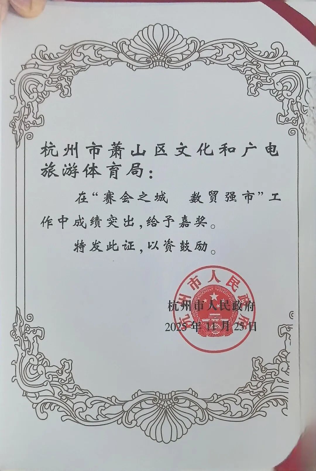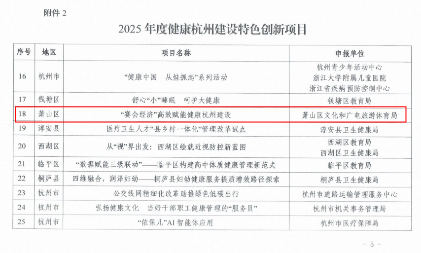 好消息不断,杭州市政府对“赛会之城 数贸强市”工作中成绩突出的集体和个人给予行政奖励,区文广旅游体育局获集体嘉奖。此外,健康杭州建设领导小组办公室公布了2025年度健康杭州建设优秀创新项目、特色创新项目和培育创新项目名单,区文广旅游体育局报送的《萧山“赛会经济”赋能健康杭州建设》项目获得“特色创新项目”殊荣,为健康杭州建设再添亮眼成果!