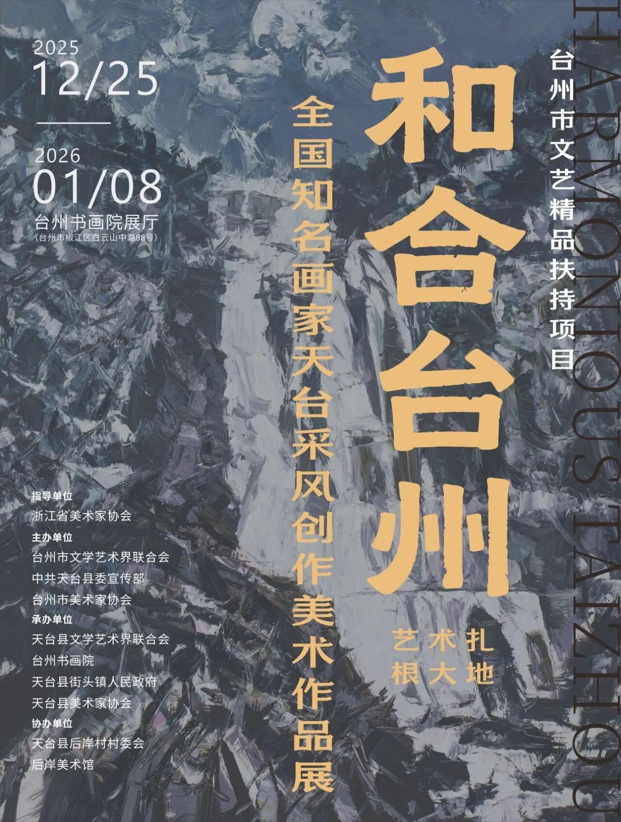 12月25日,“艺术扎根大地·和合台州”——全国知名画家天台采风创作美术作品展在台州书画院正式拉开帷幕。此次巡展由浙江省美协指导,台州市文联、天台县委宣传部、台州市美协联合主办,是一场扎根乡村沃土、彰显和合文化魅力的重要艺术实践。展览汇集70余件优秀作品,涵盖油画、国画、水彩(粉)画等多个品类,为观众奉上兼具视觉冲击力与文化厚重感的艺术盛宴。据悉,本次巡展主展期为2025年12月25日至2026年1月8日;后续,天台书画院(暂定)、后岸美术馆还将接力展出,让艺术之美持续浸润乡村。