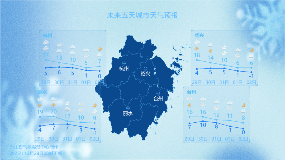 预计12月30日至1月2日,受强冷空气影响,中东部大部地区气温将下降6~8℃,江南东部、江汉西部、华南北部等地部分地区气温下降10℃以上,1月3日早晨最低气温0℃线将南压至江南中部一带;上述部分地区伴有4~5级风,阵风6~8级;东部和南部海域有6~7级风,阵风8~10级,东南部海域局部阵风11级。