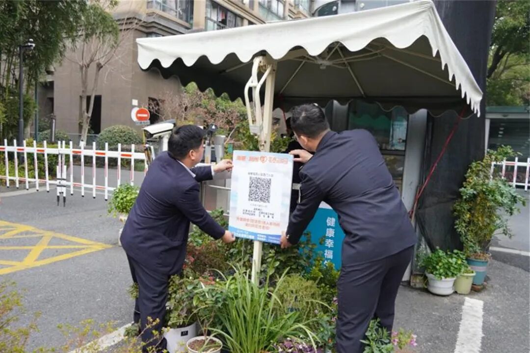 近日,富阳区市场监管局工作人员来到金都铭苑门口,给小区换上了“富春小哥码”2.0场所扫码牌。