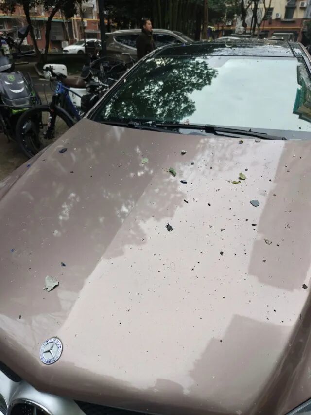 楼下停着的一辆奔驰轿车,车顶和车窗还都有楼上飘落下来的蓝色玻璃残渣,以及一些燃烧遗留物。