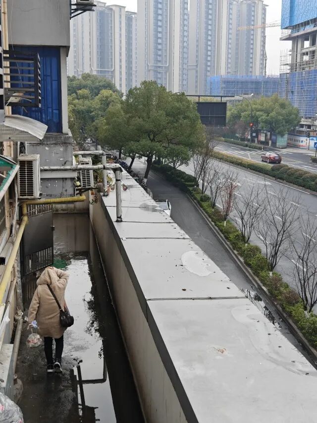起火的2幢虽然沿街,但这栋楼格局和其他楼有所不同,一楼是沿街店铺,因此居民需要走一段楼梯再上楼。记者跟着小区保安一起上楼,楼梯全是流动的积水,五楼一户人家开着门,不停把家里的积水往外倒。