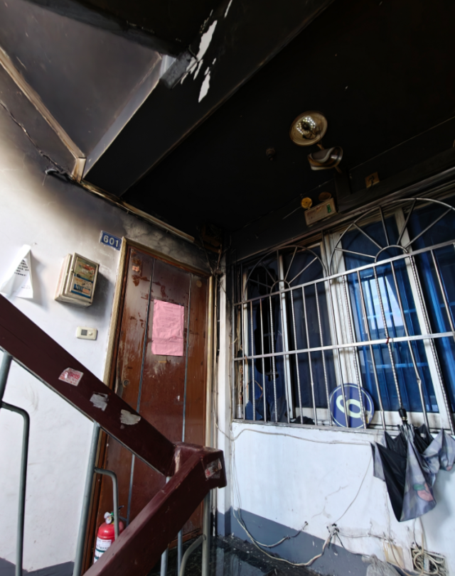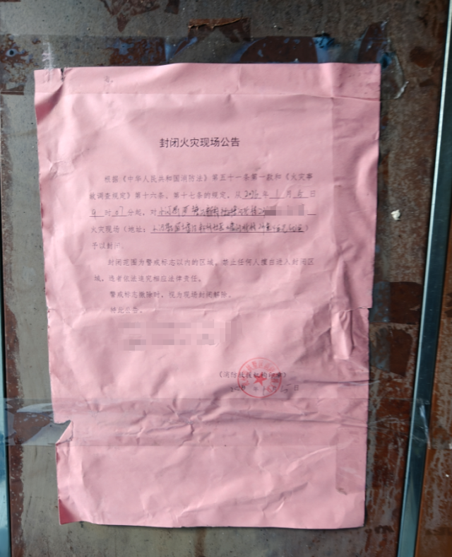 六楼起火的房间已被消防部门拉起了警戒线,并张贴了封闭火灾的现场公告。从破裂的窗户往里能看到,房间里烧得严重,整个屋子全部熏黑了。