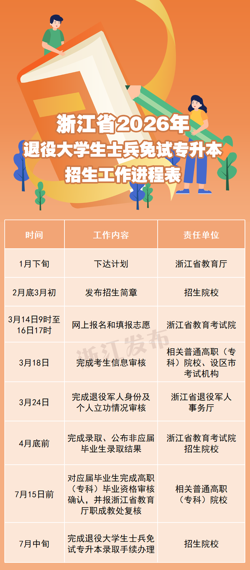 2026年3月18日前,相关高职(专科)院校负责对完成网上信息输入的本校应届、往届毕业学生进行网上资格审核;各设区市教育考试机构负责对完成网上信息输入的在本市应征入伍的外省就读应届、往届毕业学生进行网上资格审核。3月24日前,浙江省退役军人事务部门完成退役军人身份、个人立功情况审核。