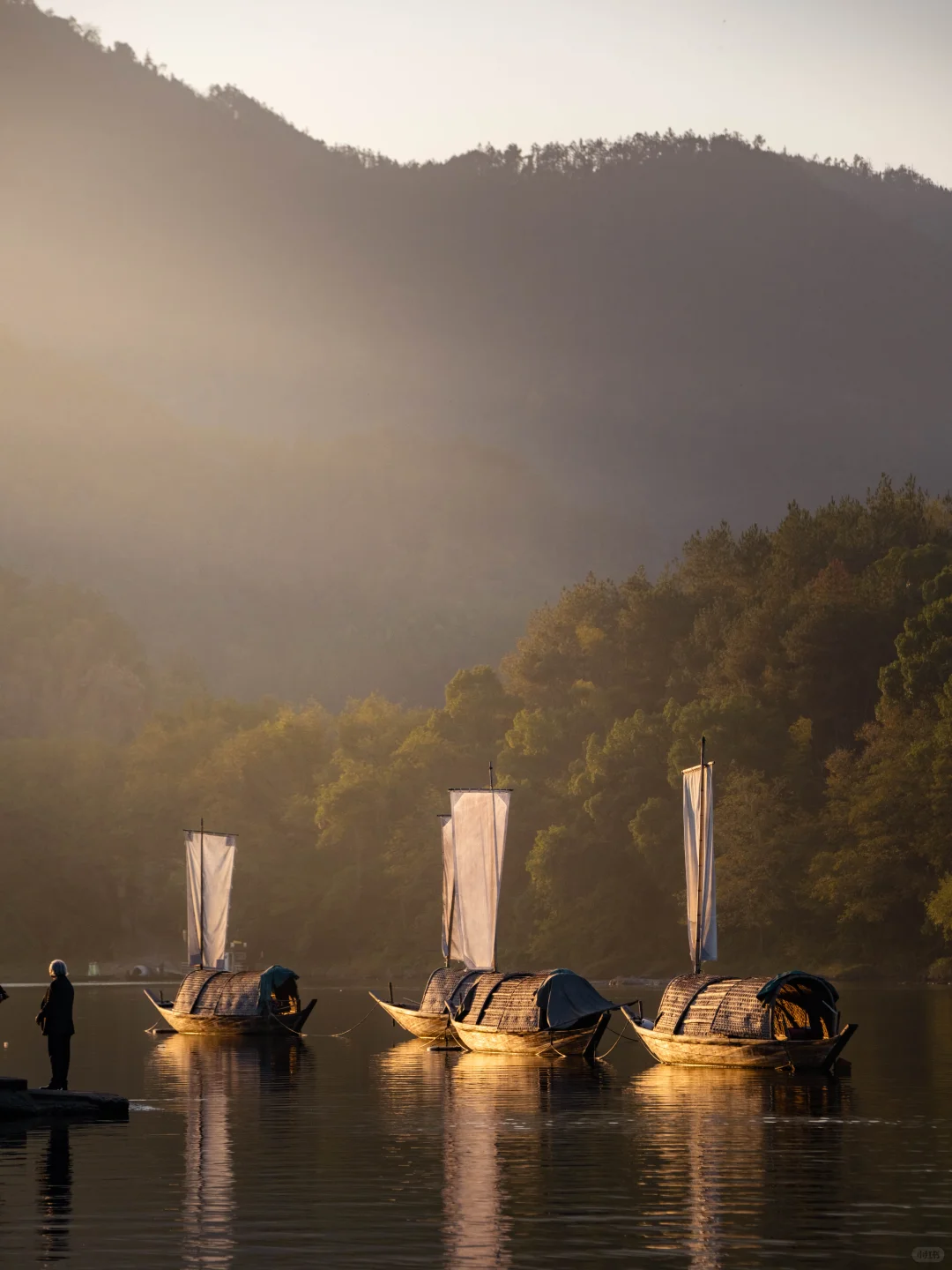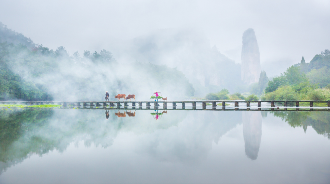 朱潭山的名场面便是蓑衣斗笠的老农牵牛走过丁步桥,红衣老妇挑担相随,黄犬偶入画。立于石桥上听水声泠泠,清风拂面时,恍惚间自己也成了那山水里的人。