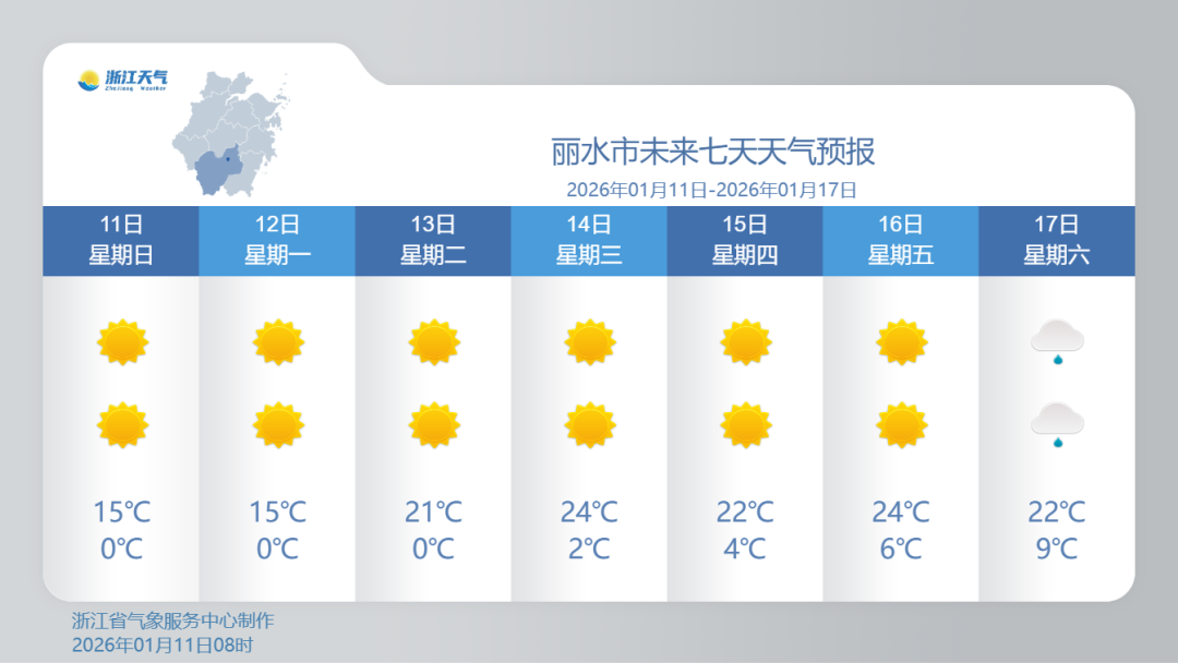 预计14日到17日,全省大部最高气温可达18-23℃。丽水、温州、衢州等地甚至准备向21℃+发起挑战。最低气温也会跟着往上走,13-14日我省大部最低4-6℃。