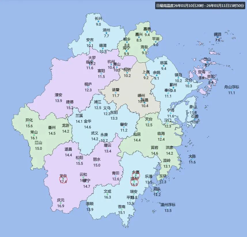 昨天最高气温集体走下坡,浙南和东南沿海享受着13-16℃的待遇,浙北只能达到8-10℃,其他地方在11-13℃之间摇摆。