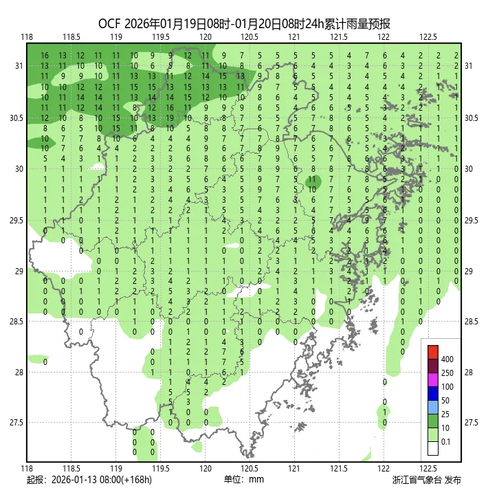 1月19日,浙江降雨预测。图源:浙江天气