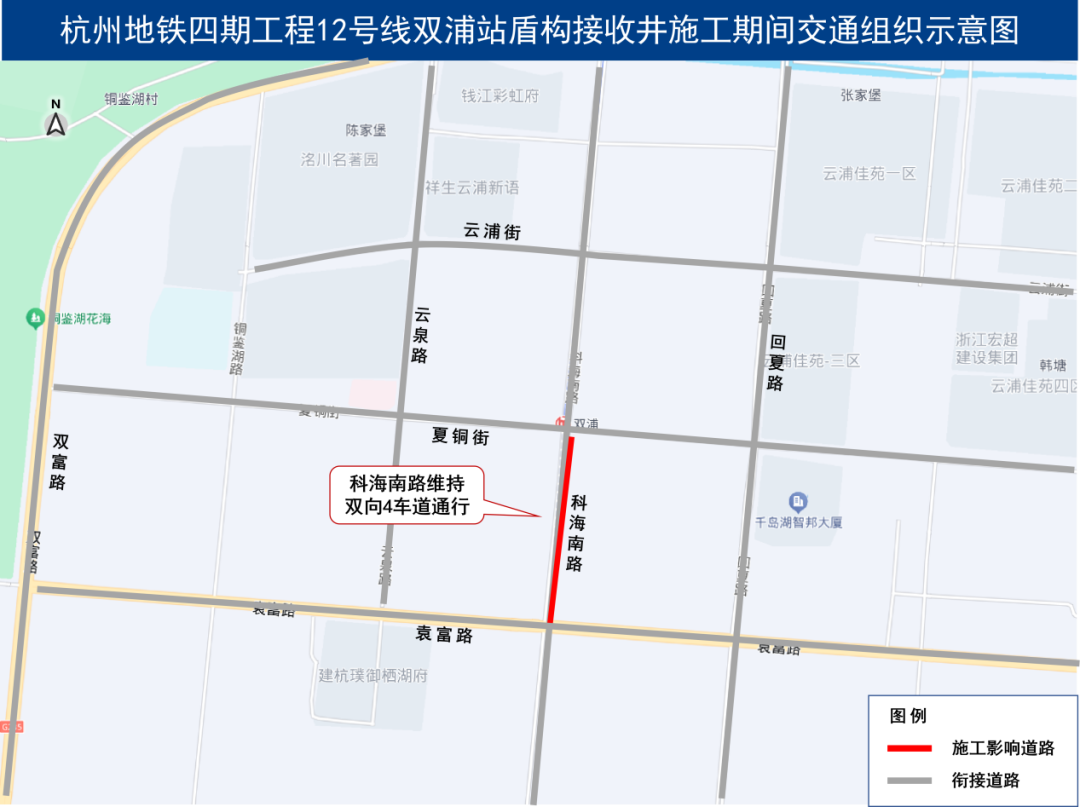 一、2026年1月20日至2027年4月30日,地铁12号线双浦站盾构接收井工程范围内的科海南路(夏铜街—袁富路)将占用部分道路空间施工。施工期间,科海南路(夏铜街—袁富路)局部道路线形调整,路段维持双向4车道通行不变。
