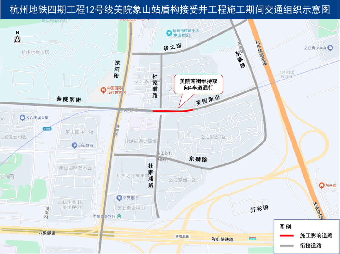 二、2026年1月20日至2027年1月20日,地铁12号线美院象山站盾构接收井工程范围内的美院南街(洙泗路一杜家浦路以东)将占用部分道路空间施工。施工期间,美院南街(洙泗路一杜家浦路以东)局部道路线形调整,路段维持双向4车道通行不变。