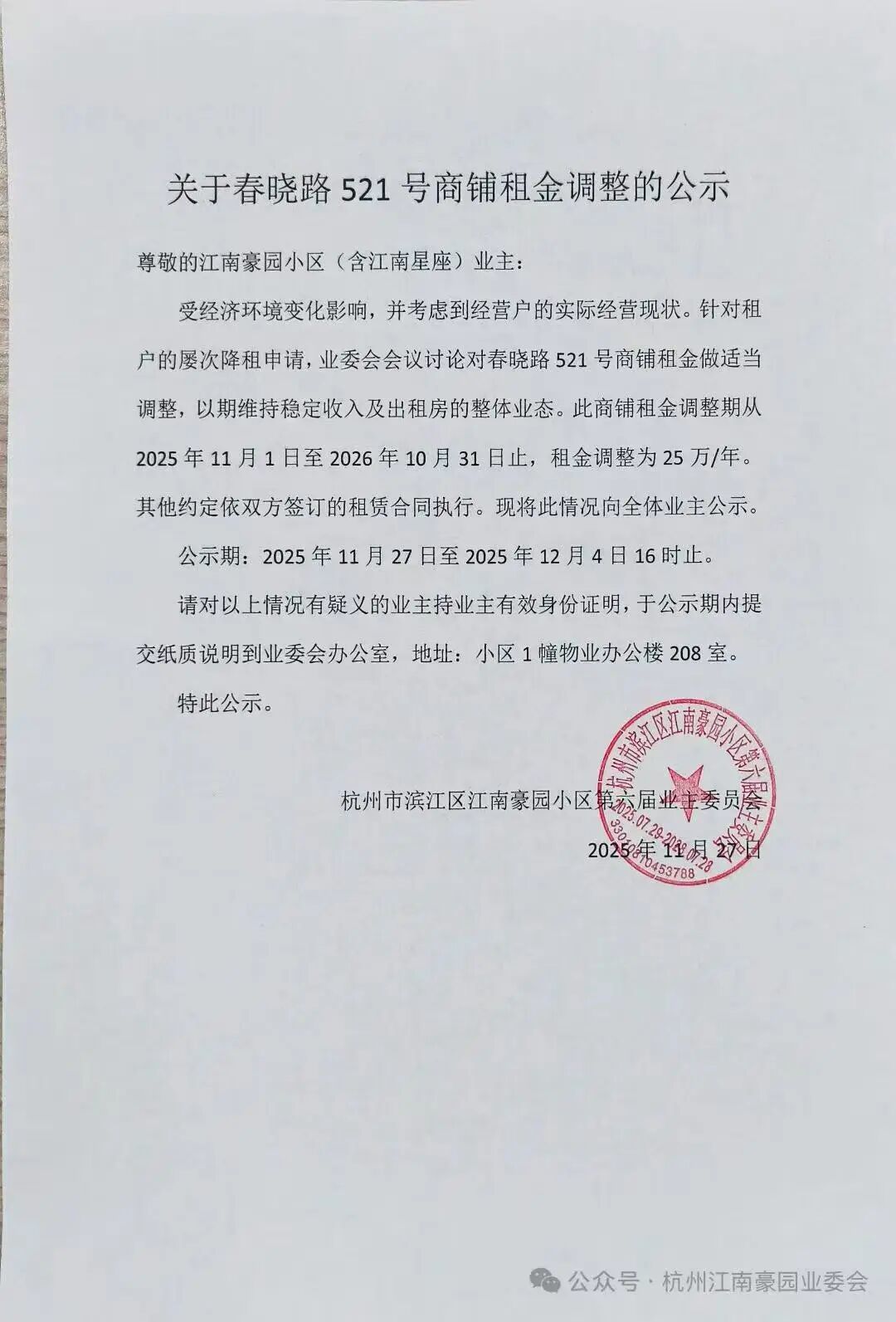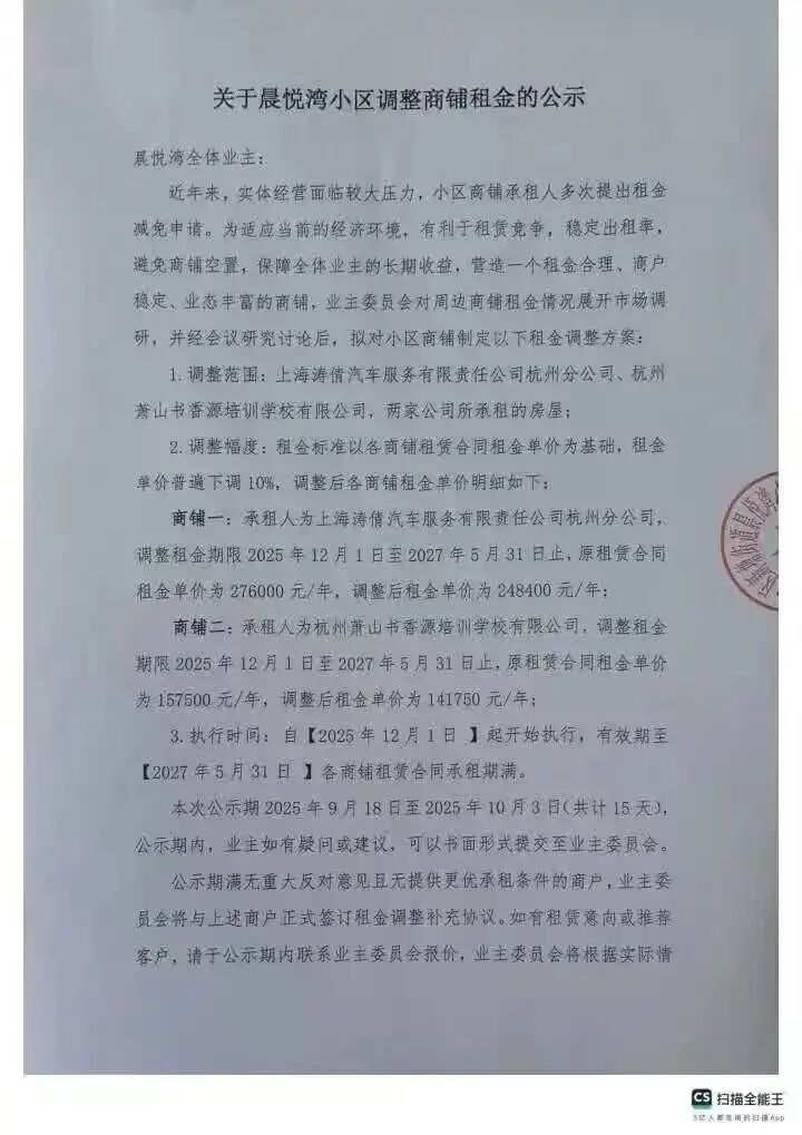 除此以外,2025年,也有一些小区的公共收益出现了下滑,主要原因在于小区物业经营用房租金下跌甚至空置。如滨江区的江南豪园在2025年11月底发布公告,将对物业经营用房的商铺租金做适当降价;九堡的望钱塘云庄小区,调整小区健身房承租方2026年的租金,每月降低3000元;萧山新塘新城香悦半岛小区,也曾在2025年9月发布公告,称为稳定出租率、避免商铺空置,保障全体业主的长期收益,业委会决定调整物业经营用房两个商铺的租金,单价均下调10%。