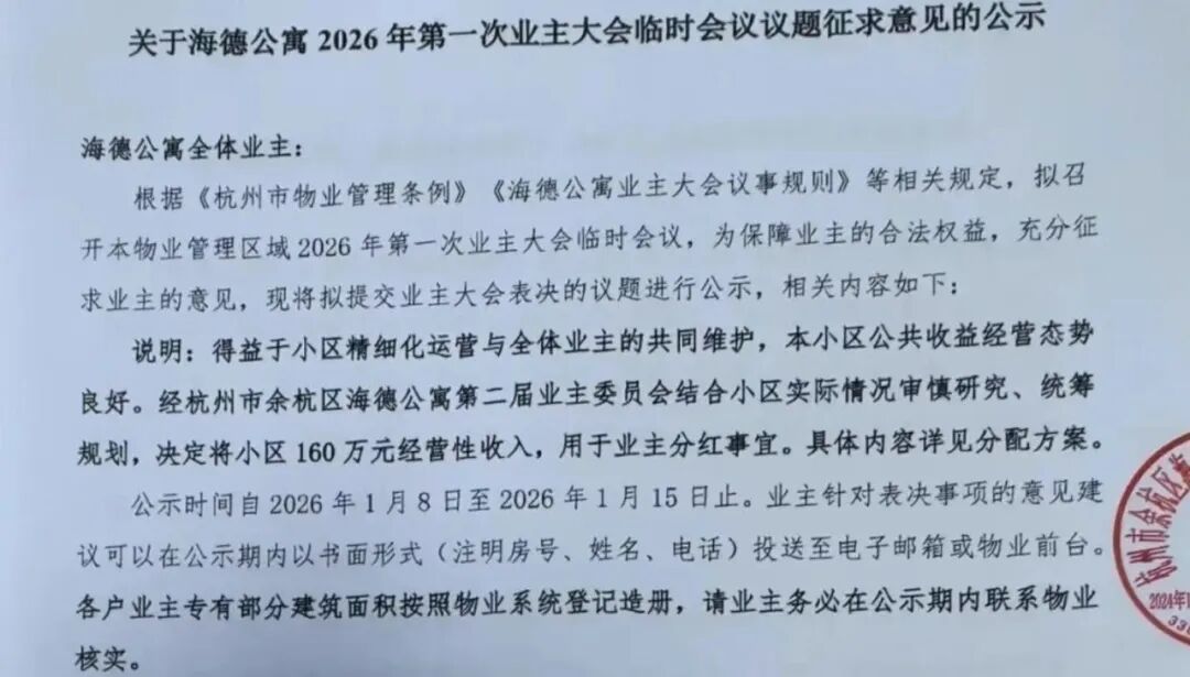 杭州多个小区的公共收益十分可观,还给业主发起了“红包”。拱墅区的首开杭州金茂府小区第一届业委会在1月18日发布公示信息,称业委会在多方统筹、积极盘活小区公共收益的努力下,业主公共账户资金实现较大增长,因此将为小区所有业主每户发放一张面值为150元的物美超市购物卡作为新春福利;下沙沿江的金隅观澜时代天筑小区也在1月14日发布业主福利,每户人家将发放一份大米与食用油;还有良渚的海德公寓小区,在1月9日宣布拿出160万元的经营性收入,给业主发红包,1400多户住宅和全部商铺的业主,每户可以领到11.64元/㎡,据说最多一户将拿到2258.16元。