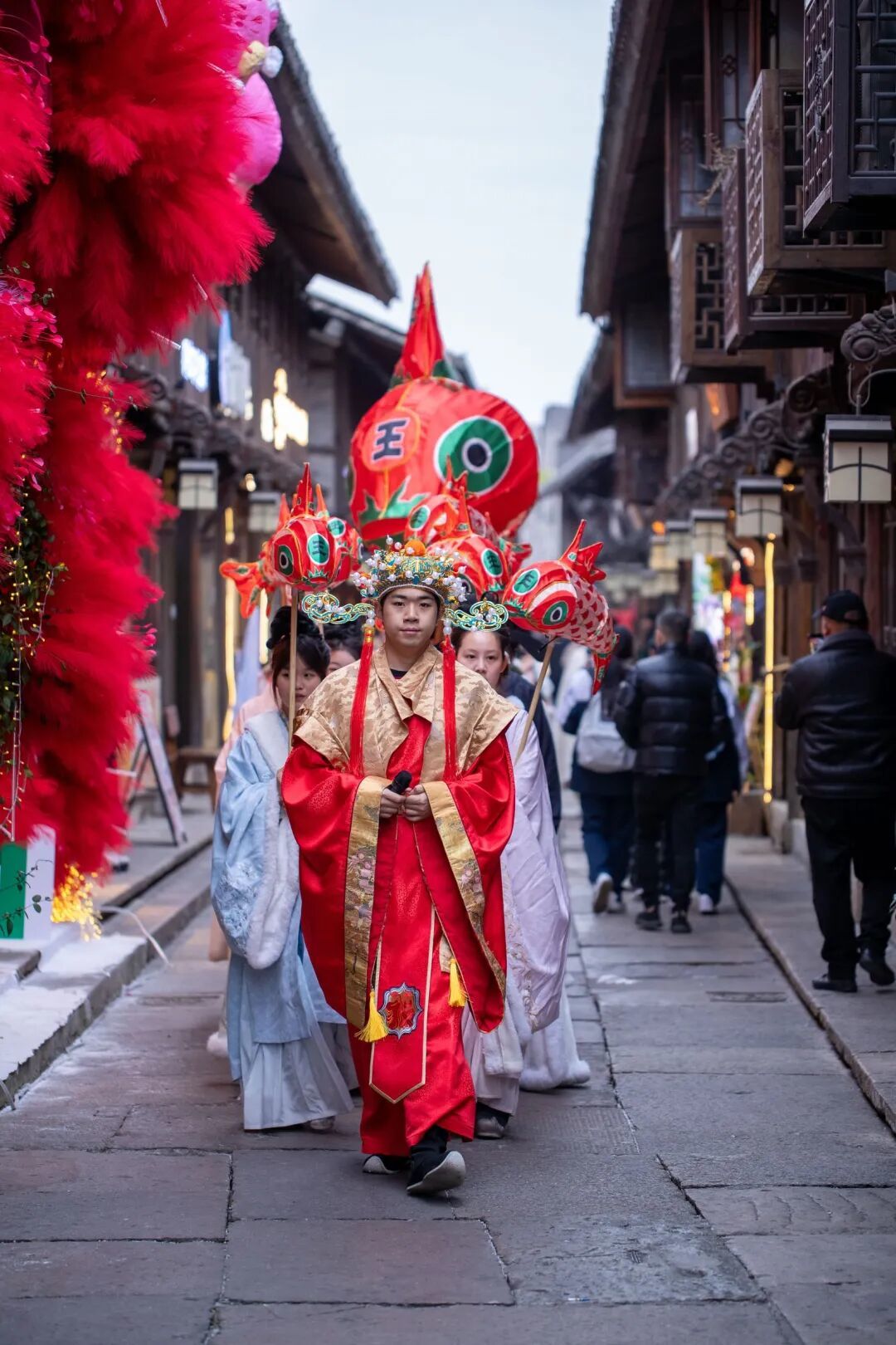 最是热闹吸睛的当属十里长街巡游环节,身着特色服饰的巡游队伍缓缓前行,与沿途高挂的红灯笼相映成趣。市民游客纷纷驻足拍照,沉浸体验这份独属新春的烟火与仪式。