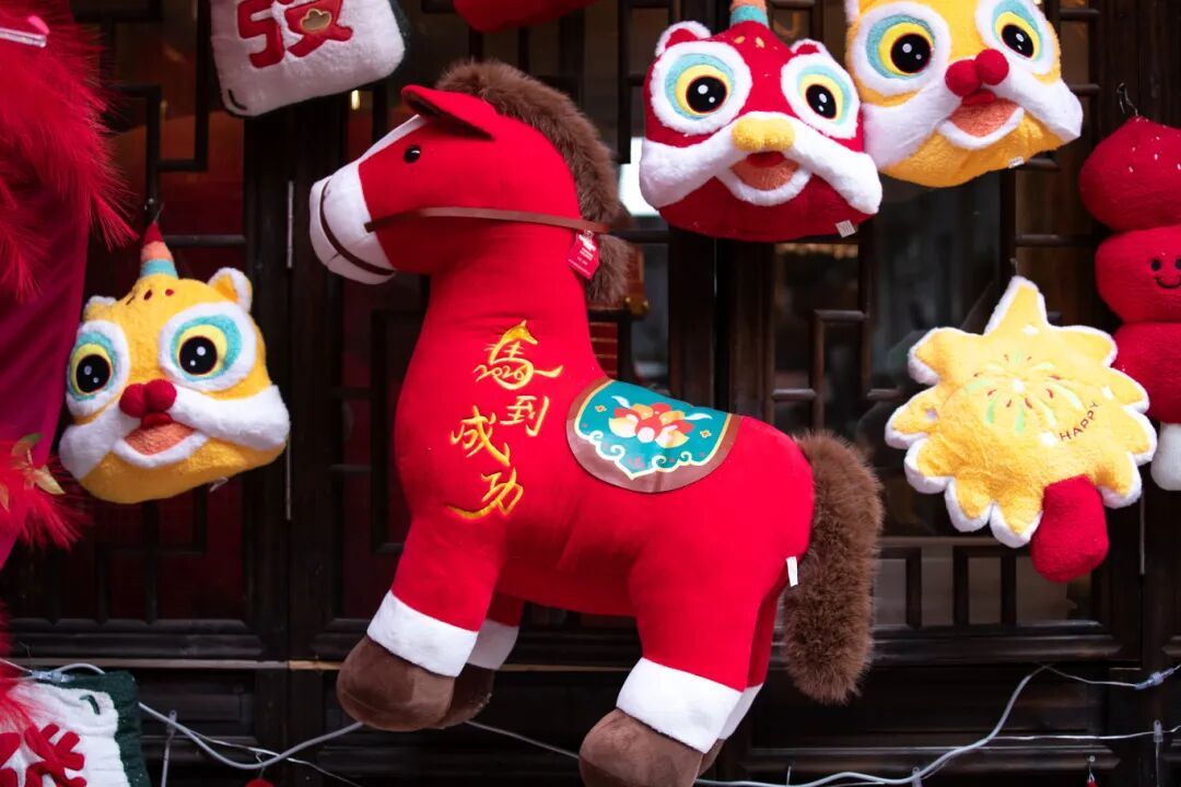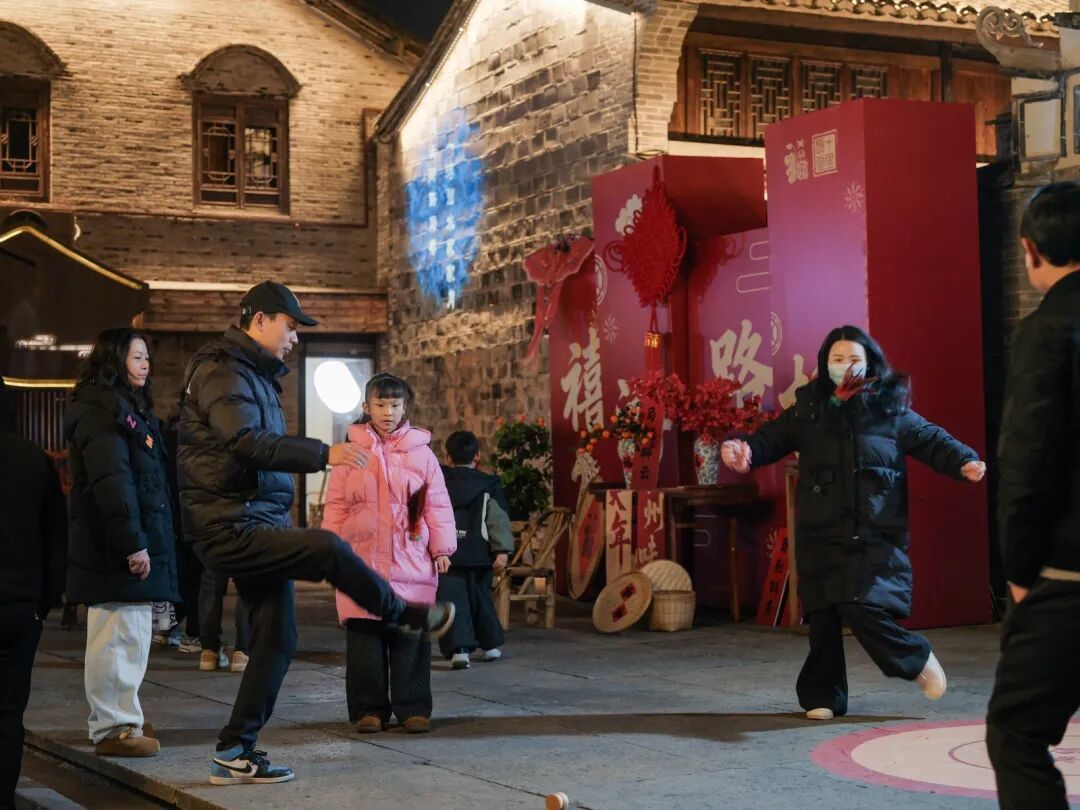街区的各个角落还藏着不少惊喜彩蛋:踢毽子、抽陀螺等传统游戏唤醒童年记忆,欢笑不断;黄金许愿树下,写满心愿的红绸随风轻扬;马年主题打卡点前,年轻人排队合影,记录新春笑颜。就连三联书店、非遗百工馆、杨晨故居也妆点上马年巧思,随手一拍皆是年意。