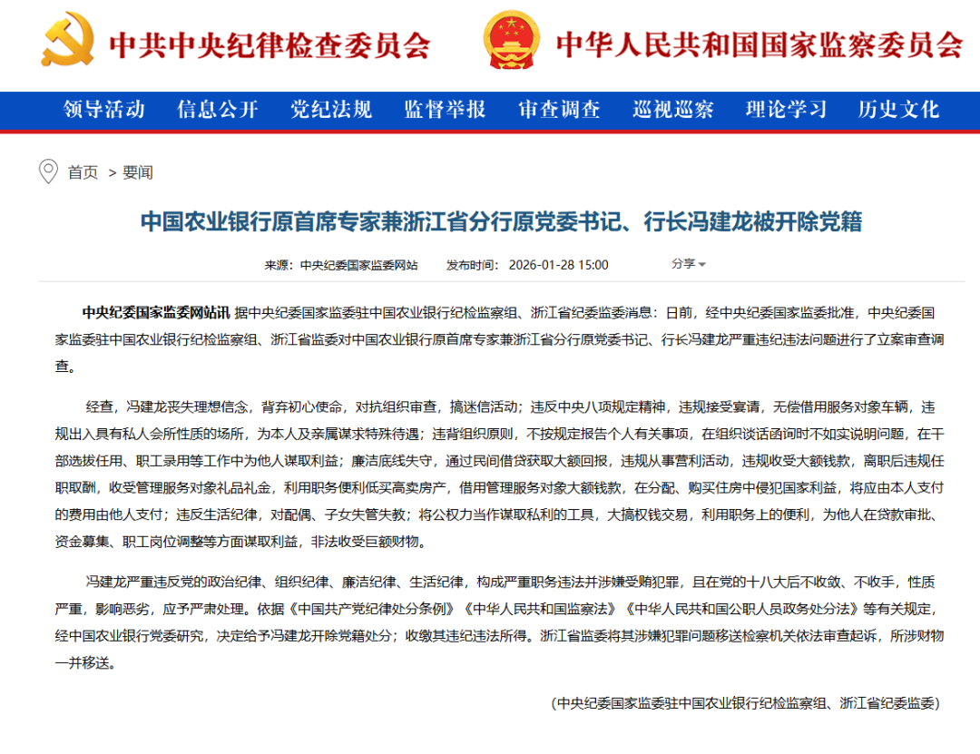 据中央纪委国家监委驻中国农业银行纪检监察组、浙江省纪委监委消息:日前,经中央纪委国家监委批准,中央纪委国家监委驻中国农业银行纪检监察组、浙江省监委对中国农业银行原首席专家兼浙江省分行原党委书记、行长冯建龙严重违纪违法问题进行了立案审查调查。