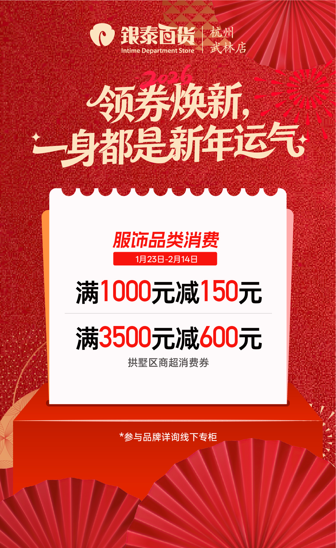 1月23日至2月14日期间,逛武林银泰百货买年货的顾客,在享受商场的优惠力度之余,还能享受拱墅区商超消费券的优惠。此外,1月28日-2月23日,场内大牌美妆推出了800元团1000元代金券活动,还有多款马年美妆礼盒上新,新年买新妆更加划算。