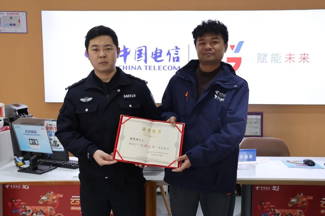 民警为姚东权(右)送上“大桥卫士”荣誉证书和徽章