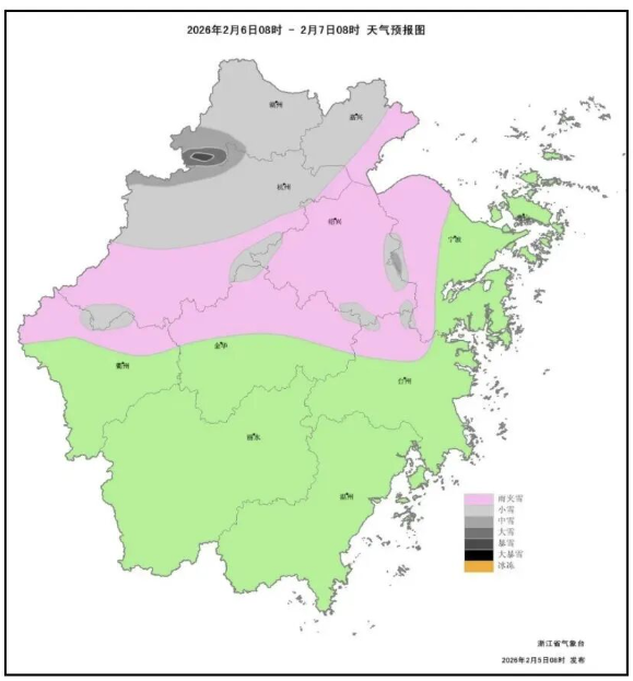 预计,今天中午起,浙北山区率先转雨夹雪或雪,部分中到大雪,高山区局部暴雪;下午起浙北部分平原地区有雨夹雪,傍晚起雨夹雪或雪。量级来看,浙北山区部分有中到大雪,高山区大到暴雪,浙西南山区局地还有冻雨。