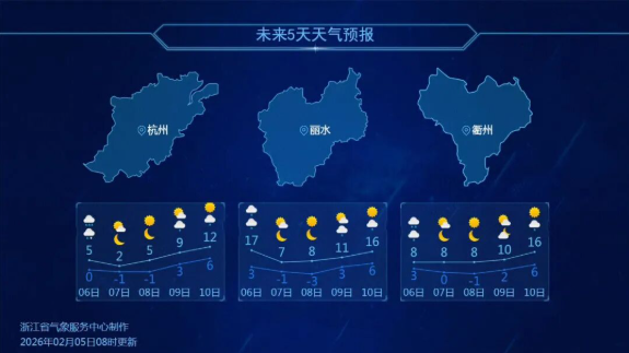 据浙江省气象台预报,受寒潮影响,昨天(2月5日)夜里至明天,全省自北而南有明显降温、雨(雪)和大风天气,大部地区日平均气温过程降温幅度10~12℃。