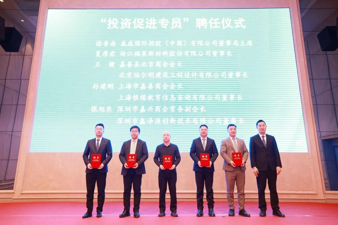 活动中,盛威国际控股(中国)有限公司董事局主席徐普南、浙江福莱新材料股份有限公司董事长夏厚君、嘉善县北京商会会长王健、上海市嘉善商会会长孙建刚、深圳市嘉兴商会常务副会长张旭东受聘为“投资促进专员”,进一步拓宽招商渠道,引聚更多优质项目、优秀人才。