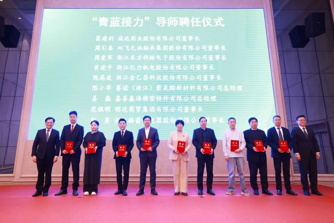 活动中,诚达药业股份有限公司董事长葛建利、浙江双飞无油轴承集团股份有限公司董事长周引春、浙江东方科脉电子股份有限公司董事长周爱军、浙江亿力机电股份有限公司董事长黄建平、浙江金乙昌科技股份有限公司董事长陈高波、赛诺(浙江)聚氨酯新材料有限公司总经理陈小华、嘉善鑫海精密铸件有限公司总经理姜淼、明达商贸集团有限公司董事长范佩明、浙江格蕾特电器有限公司董事长彭勇受聘为“蓝青接力”导师,他们将助力青年企业家成长成才,传承发扬善商优良传统。