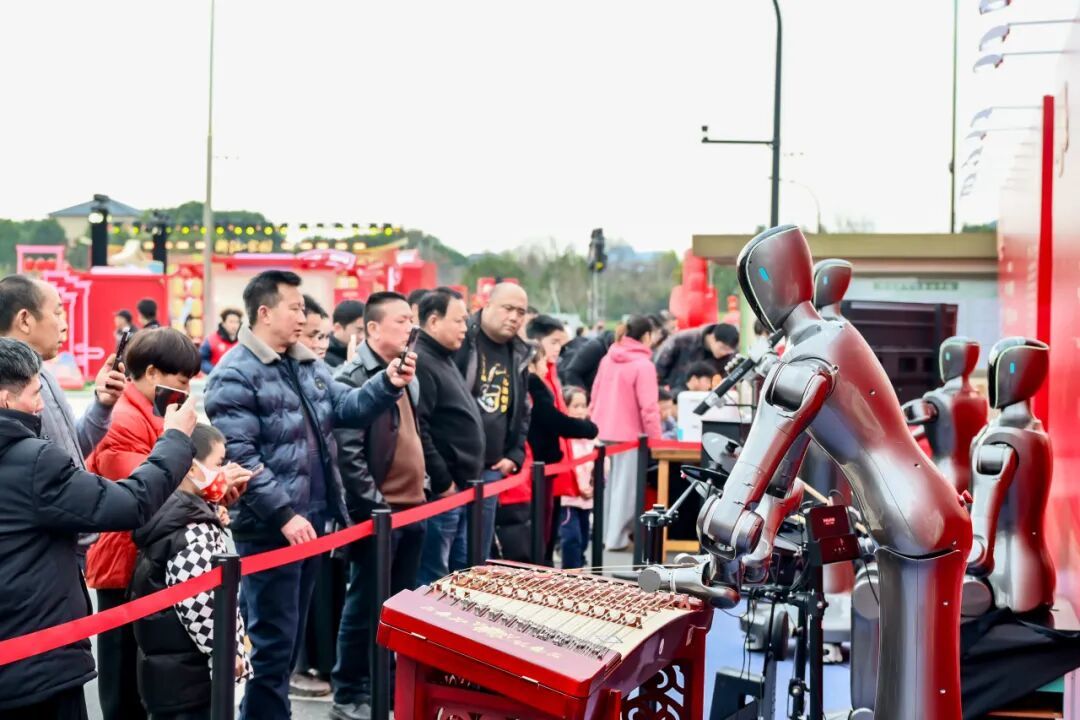 值得一提的是,当天同步开设的“骏马奔腾 余杭喜市”,也成为传统乡村文化与新潮体验交融的欢乐现场。市集围绕 “四喜” 设置了四大沉浸板块:在“喜出望外・科技体验区”,人形机器人奏响新春乐曲、智能仿生手挥毫写春联,让大家在惊喜互动中切身感受到了余杭的创新活力;“喜庆吉祥・文化特派员展示区”汇集了中泰竹笛、五常武术书法等12个镇街的文化瑰宝,使传统技艺可观可感;“喜气洋洋・非遗年俗共创区”里,市民游客亲手体验仓前剪纸、中泰竹偶等活动,浓浓年味扑面而来;而“喜闻乐见・舞台表演互动区”则好戏连台,折子戏、民谣音乐会、非遗展演等轮番上演,带来家门口的文化盛宴。