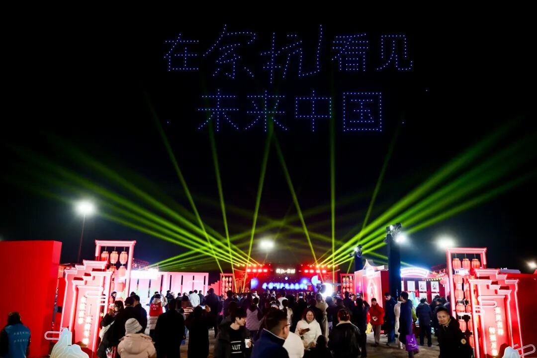 晚上七点半,村晚的演出在震撼的开场秀《天马行空·金鬃献瑞》中正式拉开帷幕。夜空中,无人机编队灵动变幻,勾勒出吉祥天马踏云而来、新年祝福跃然天际的绚烂图案,尤其是“在余杭,看见未来中国”的醒目字样,引发现场一片惊叹与欢呼。