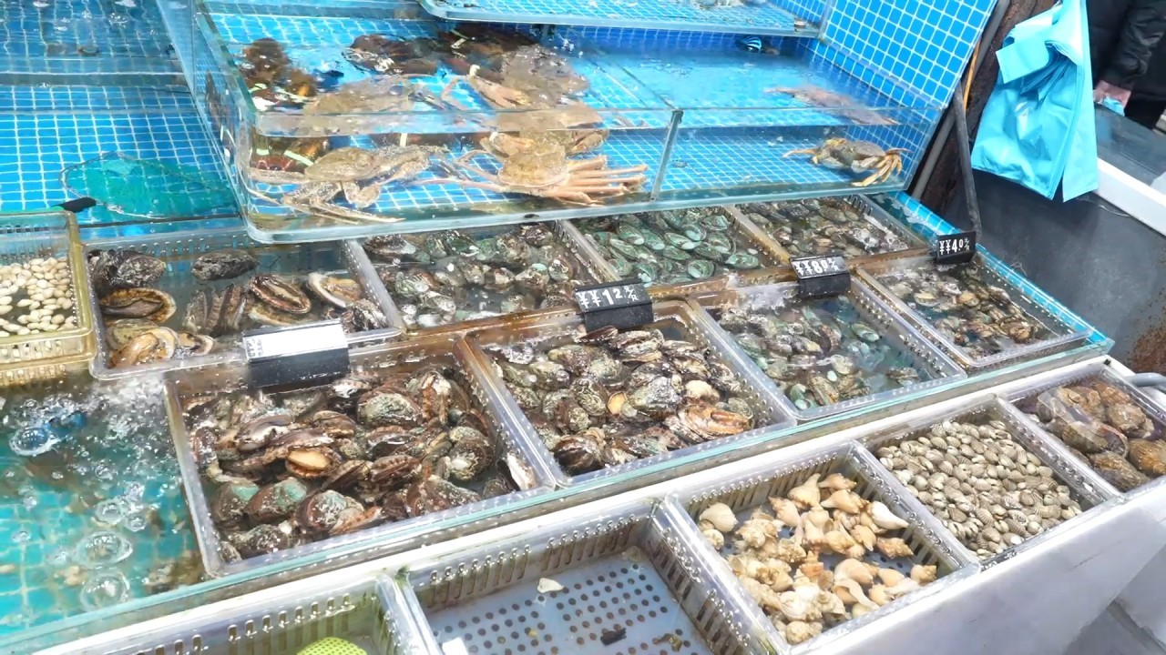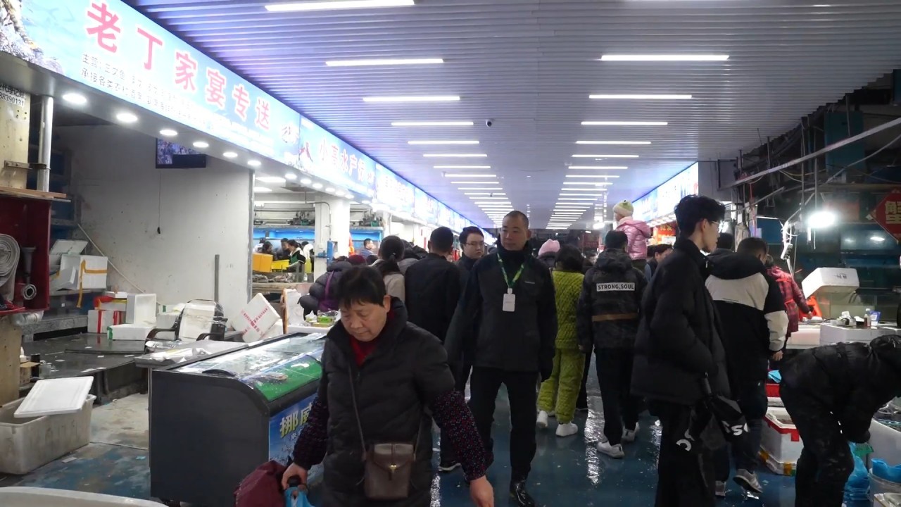 在活鲜区的玻璃缸里,波士顿龙虾、基围虾、皮皮虾活力十足,不时溅起水花;冷冻区的货架上,包装好的鱼丸、虾滑、海鲜礼盒琳琅满目,满足不同家庭的采购需求。市场内不仅有本地市民推着购物车精打细算,还有不少从嘉兴、湖州等地专程赶来的采购者。“每年都来这里囤年货,种类全、价格实,一趟就能买齐年夜饭需要的所有水产。” 来自湖州的王先生后备箱里已经装满了带鱼、黄鱼和基围虾。
