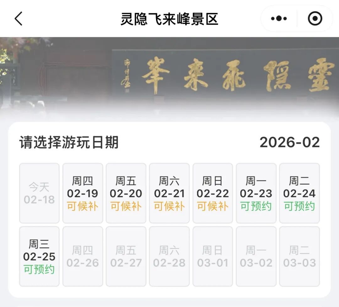 如果您还未预约,请务必尽早通过“杭州灵隐飞来峰”官方小程序提交候补。根据景区预约新规则,游客可提前7天预约,或最晚在入园前一日20:00前进行线上候补,按序配给,先到先得。在未预约的情况下,当日无法进入景区,请大家一定提前安排好行程,切勿跑空。