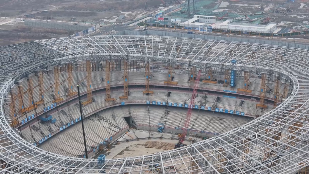项目足球场标段钢结构屋盖已顺利完成,正开展索夹安装、二次结构及机电安装、装饰工程等作业,为节后全面复工作好准备。据现场管理人员介绍,项目计划2026年3月底完成整个索结构的张拉提升工作,为后续的膜结构施工作业打下基础。