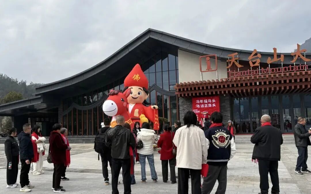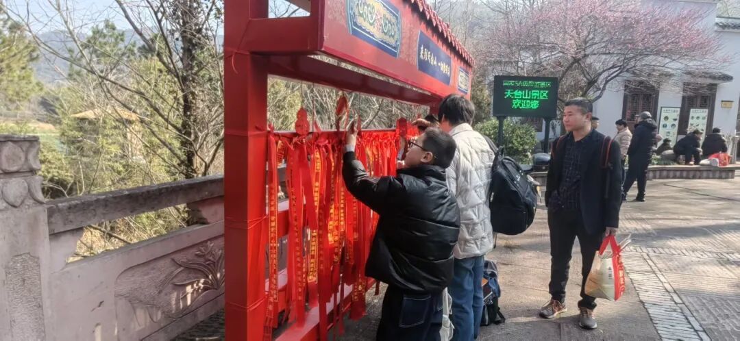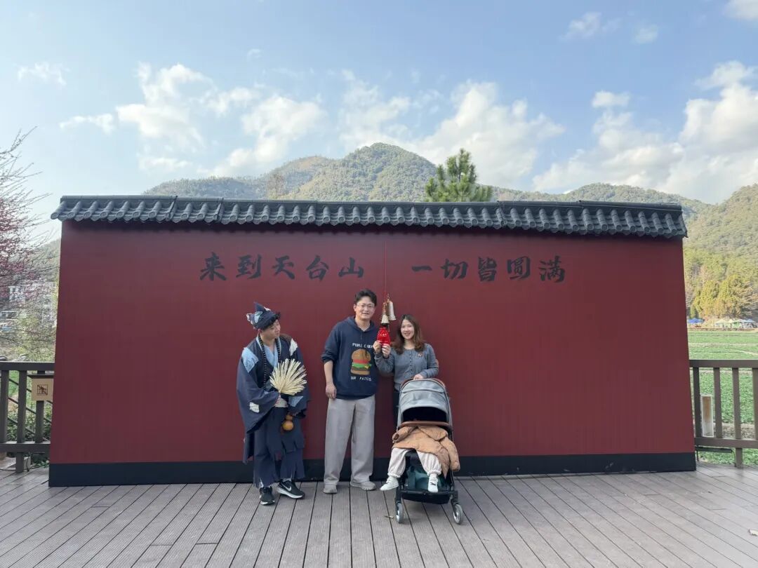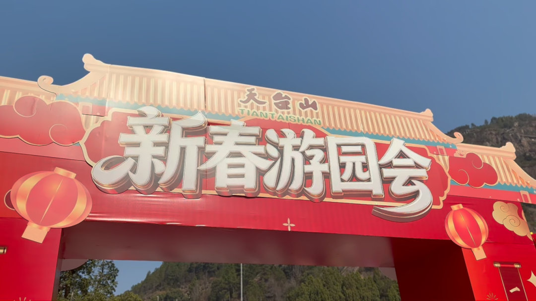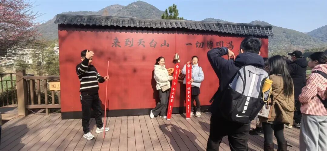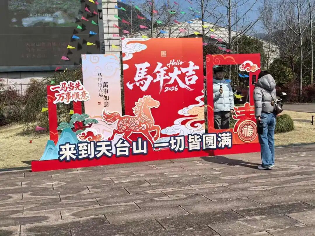 山门前的“来到天台山 一切皆圆满”背景墙前,
