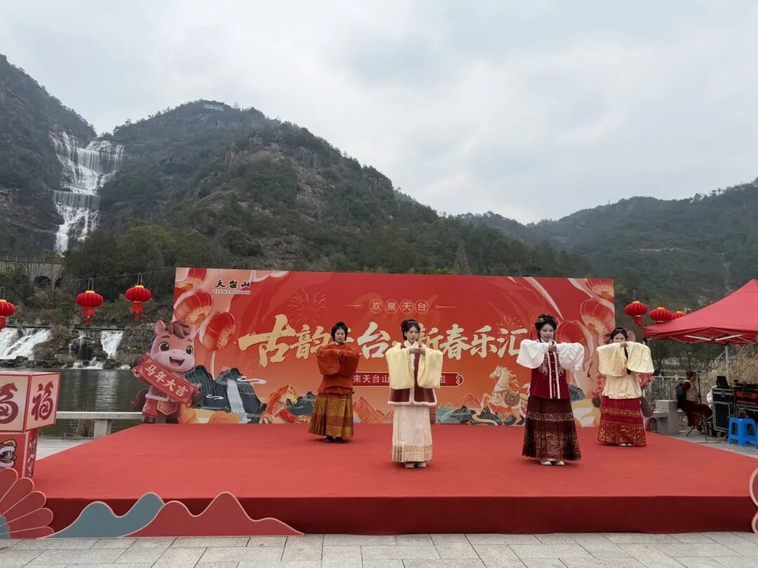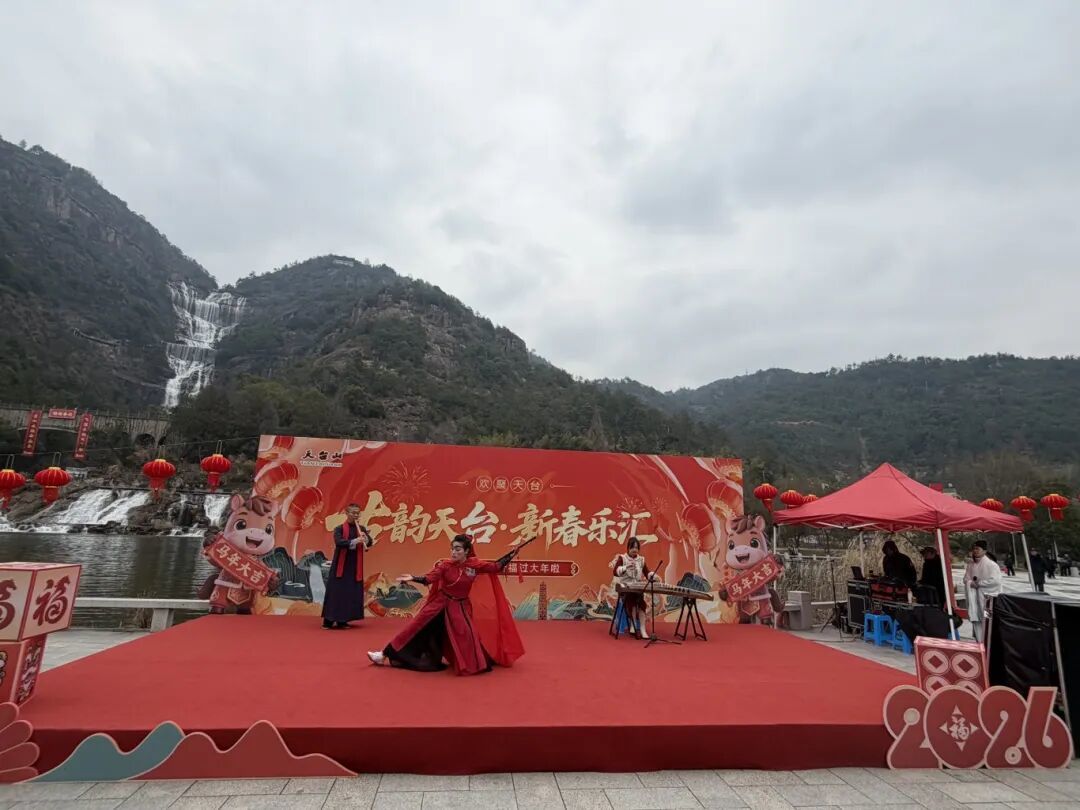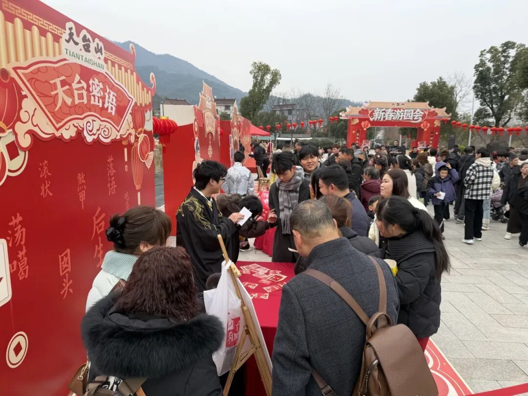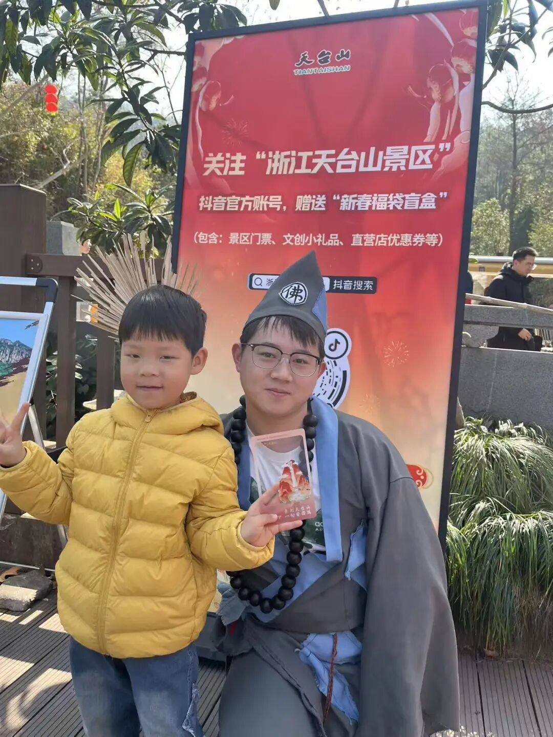 山门前的“来到天台山 一切皆圆满”背景墙前,