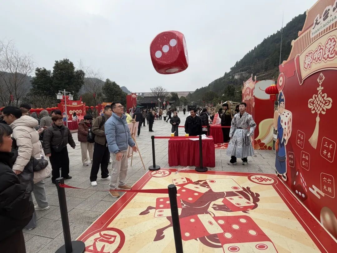 掷响乾坤,游客投掷巨型骰子,讨个“六六大顺”。